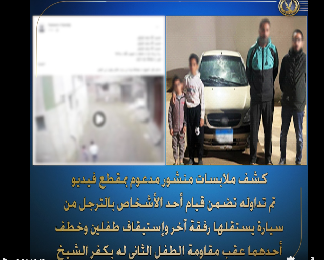 في إطار كشف ملابسات منشور مدعوم بمقطع فيديو جرى تداوله عبر مواقع التواصل الاجتماعي، تضمن قيام أحد الأشخاص بالترجل من سيارة كان يستقلها برفقة آخر، واستيقاف طفلين، ثم خطف أحدهما عقب مقاومة الطفل الثاني، وذلك بمحافظة كفر الشيخ.