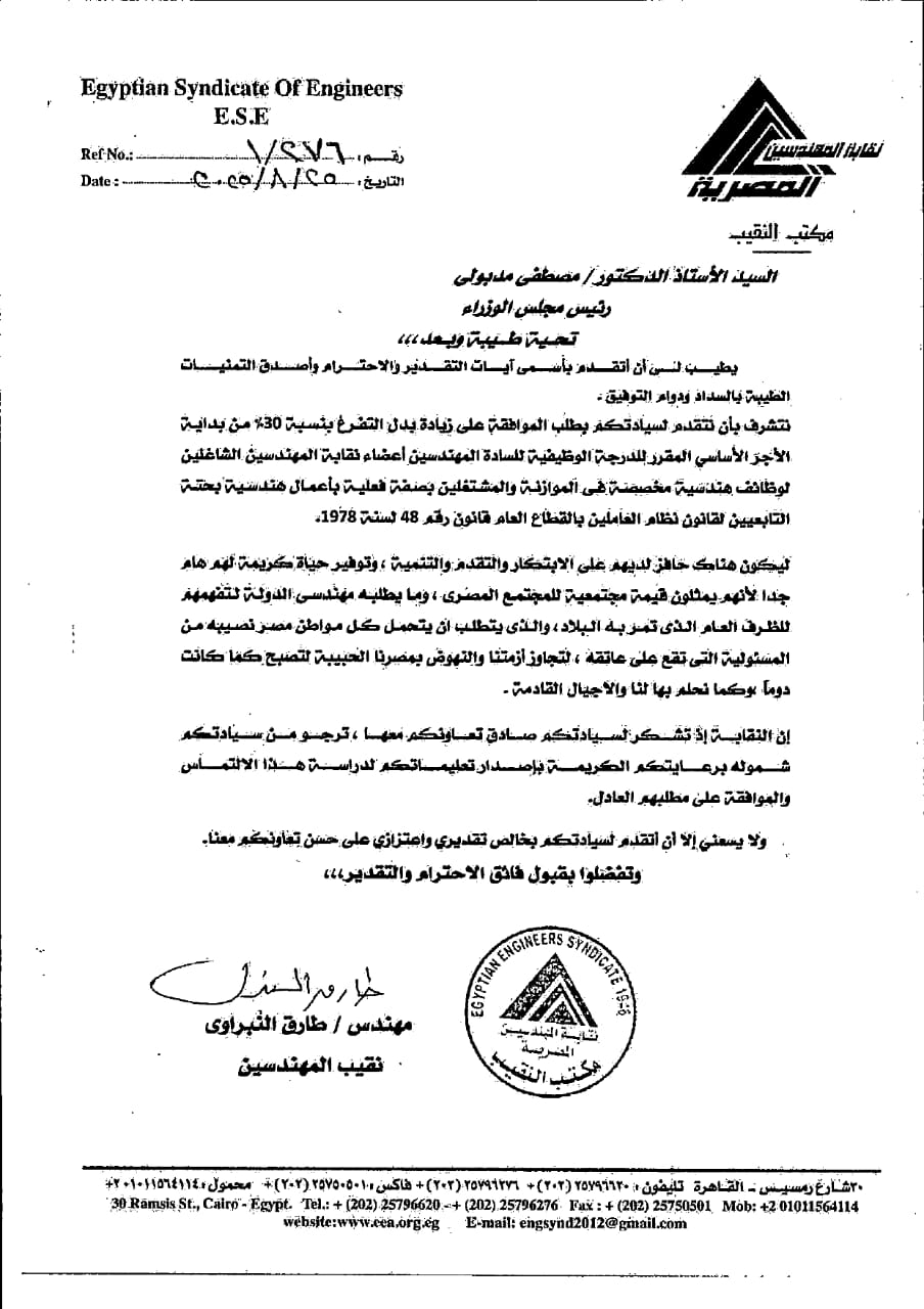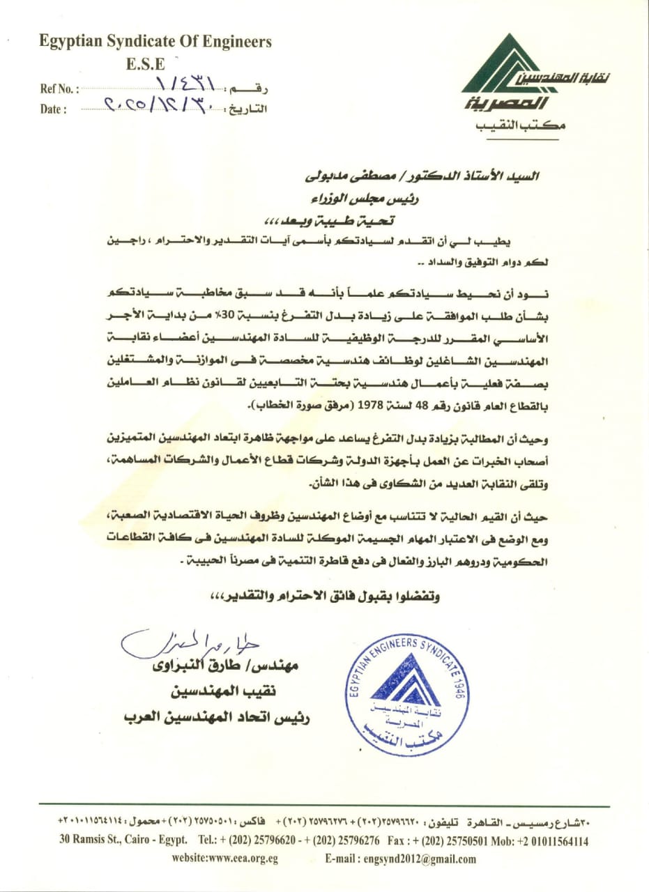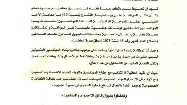 خاطب المهندس طارق النبراوي- نقيب المهندسين ورئيس اتحاد المهندسين العرب، مجددًا، الدكتور مصطفى مدبولي رئيس مجلس الوزراء، بشأن زيادة بدل التفرغ بنسبة 30% من بداية الأجر الأساسي المقرر للدرجة الوظيفية للمهندسين من أعضاء النقابة، الشاغلين لوظائف هندسية مخصصة في الموازنة، والمشتغلين بصفة فعلية بأعمال هندسية بحتة، والخاضعين لأحكام قانون نظام العاملين بالقطاع العام رقم 48 لسنة 1978، وذلك استكمالًا للمخاطبات السابقة في هذا الشأن.