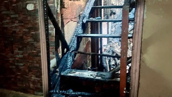 وقد نشب الحريق بالدور الأول العلوي، وتحديدًا بالغرفة الخلفية التي تضم السلم الموصل للطابق، ما أدى إلى تفحم كامل محتويات الغرفة.