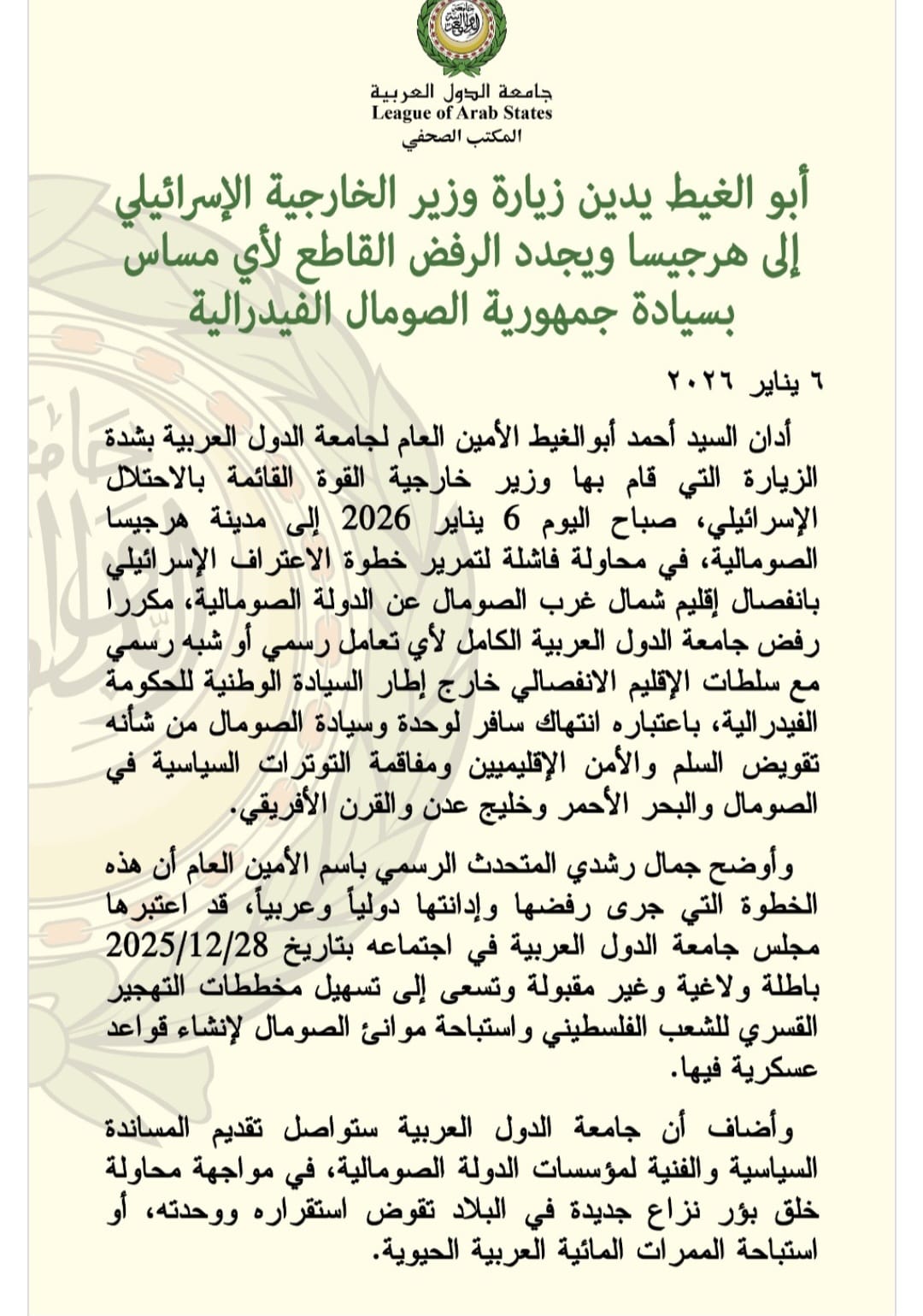 جدد الأمين العام رفض الجامعة العربية الكامل لأي تعامل رسمي أو شبه رسمي مع سلطات الإقليم الانفصالي خارج إطار الحكومة الفيدرالية الصومالية، مؤكدًا أن مثل هذه الخطوة تخالف القانون الدولي وتهدد الاستقرار الإقليمي.