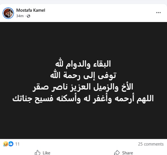 وكتب الفنان مصطفى كامل، معلنا وفاة المطرب ناصر صقر: البقاء والدوام لله توفى إلى رحمة الله الأخ والزميل العزيز ناصر صقر اللهم أرحمه وأغفر له وأسكنه فسيح جناتك.