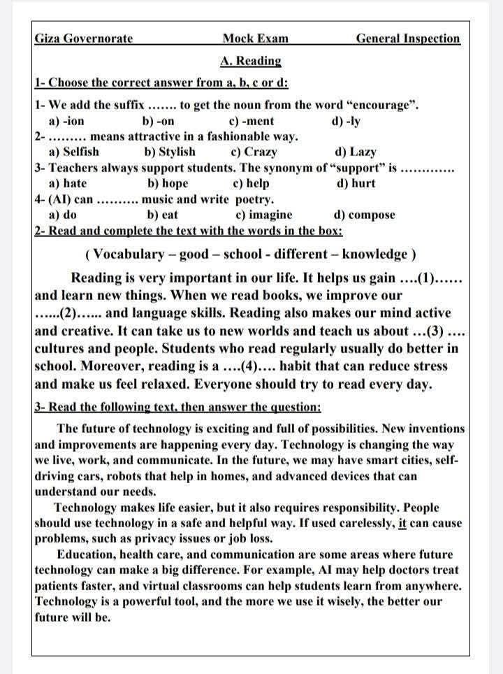 نموذج امتحان اللغة الإنجليزية للشهادة الإعدادية بالجيزة
