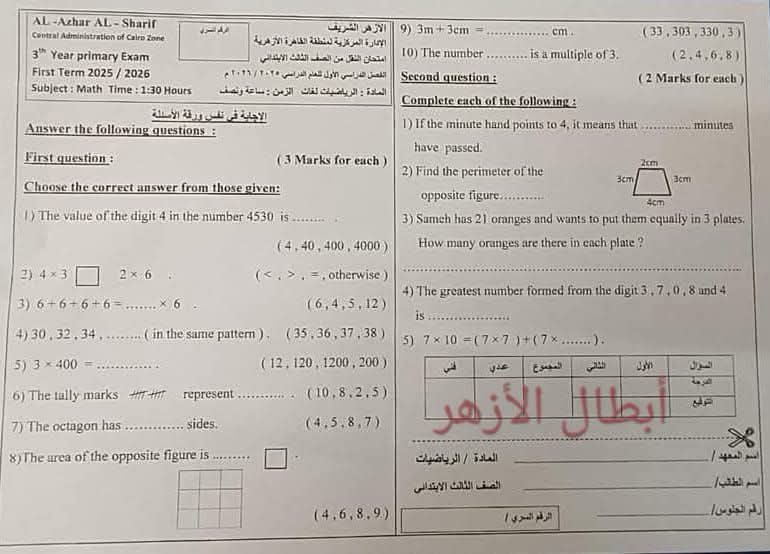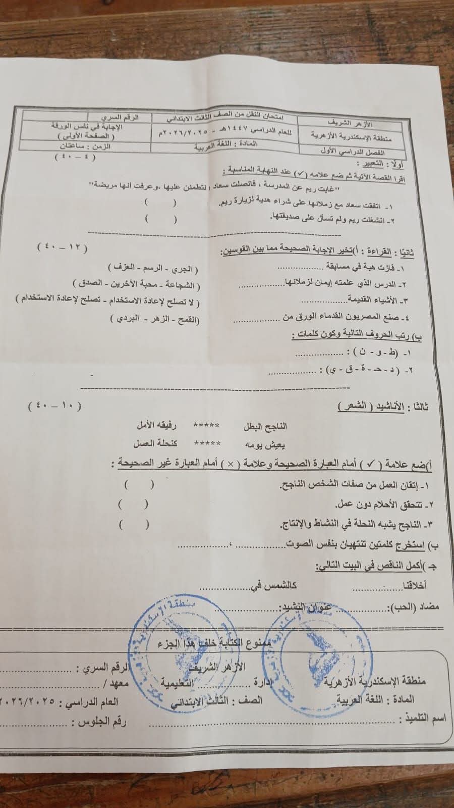 يُذكر أن امتحانات الصف الثالث الابتدائي تُعقد وفق نظام التقييم المعتمد، مع مراعاة تبسيط الأسئلة وتحقيق مبدأ تكافؤ الفرص بين جميع التلاميذ.