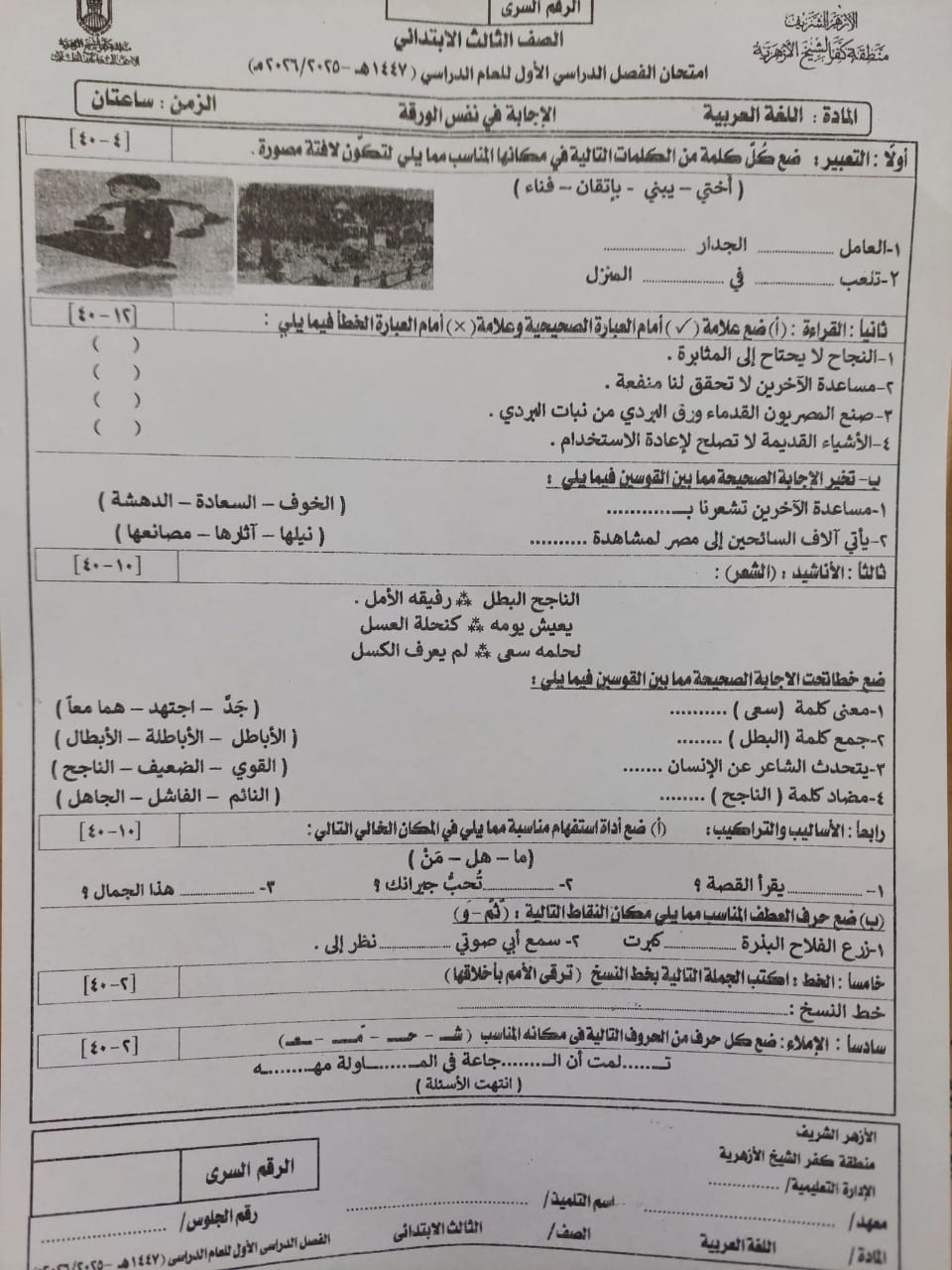 - امتحان اللغة العربية للصف الثالث الابتدائي للفصل الدراسي الأول