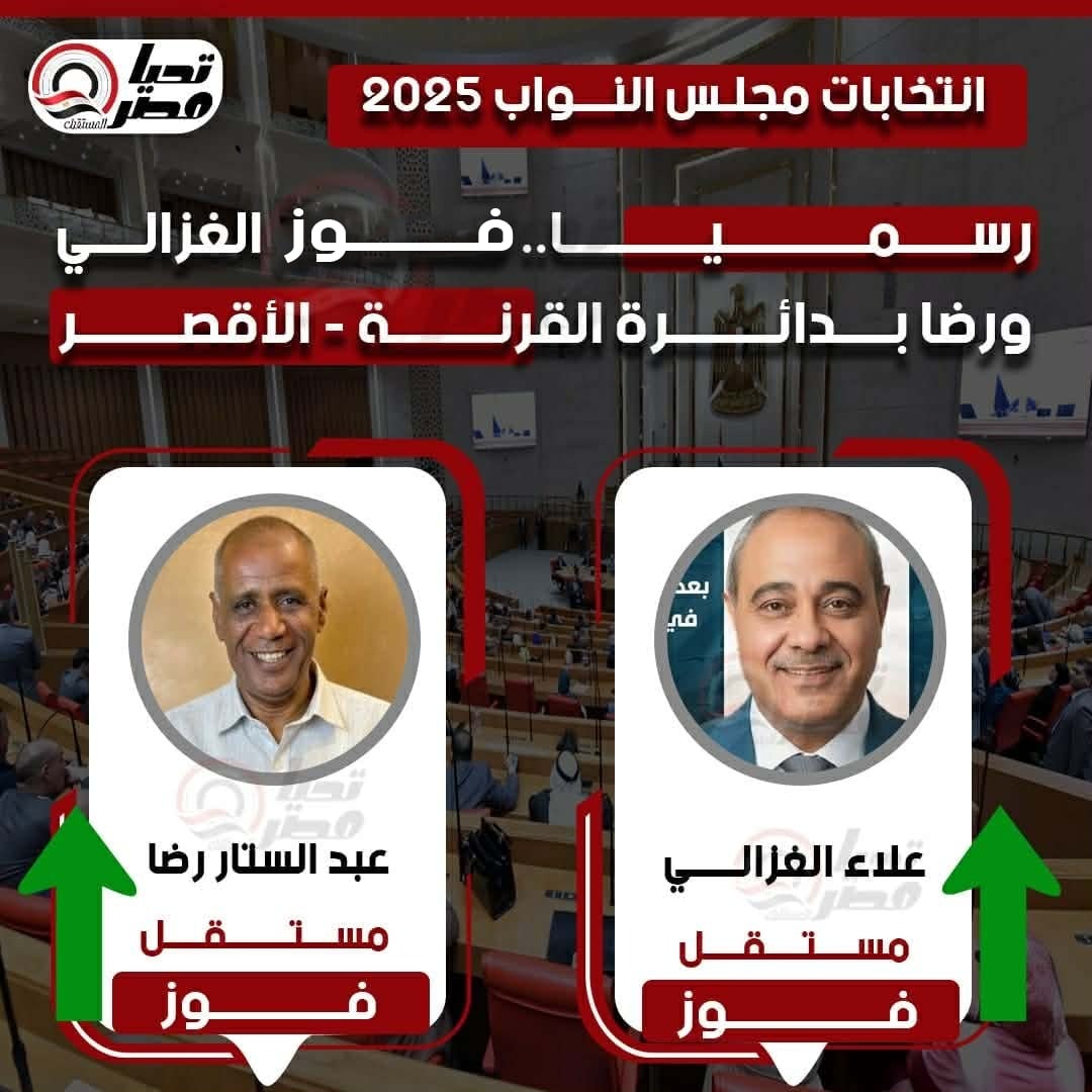 وأسفرت النتيجة عن فوز المرشحان علاء الغزالي، و عبد الستار رضا بمقعدي دائرة القرنة بمحافظة الأقصر لتكتمل مقاعد الدائرة داخل مجلس النواب بالفصل التشريعي الثالث.