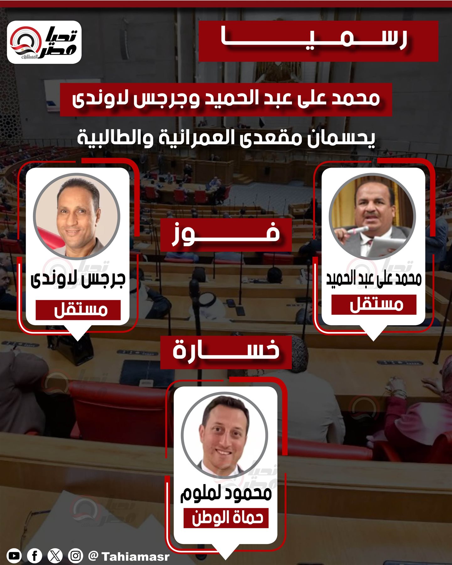 رسمياً.. محمد علي عبد الحميد وجرجس لاوندي يحسمان مقعدي العمرانية والطالبية بمجلس النواب