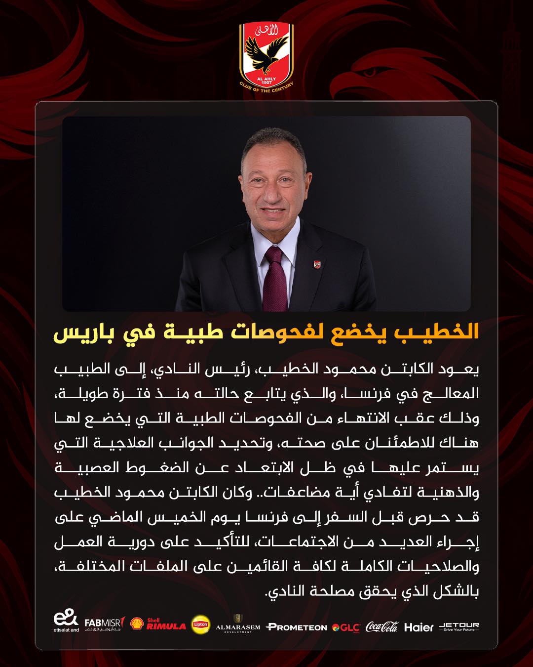 تأتي هذه الفحوصات الطبية في إطار حرص محمود الخطيب على الاطمئنان على صحته بشكل مستمر، بما يضمن استمراره في ممارسة دوره كرئيس للنادي الأهلي بكامل طاقته، كما يتابع الخطيب مع الأطباء في باريس كل جديد فيما يتعلق بالعلاج والوقاية، بما يتوافق مع آخر التطورات الطبية في مجال الرعاية الصحية للرياضيين والمسؤولين الرياضيين.
