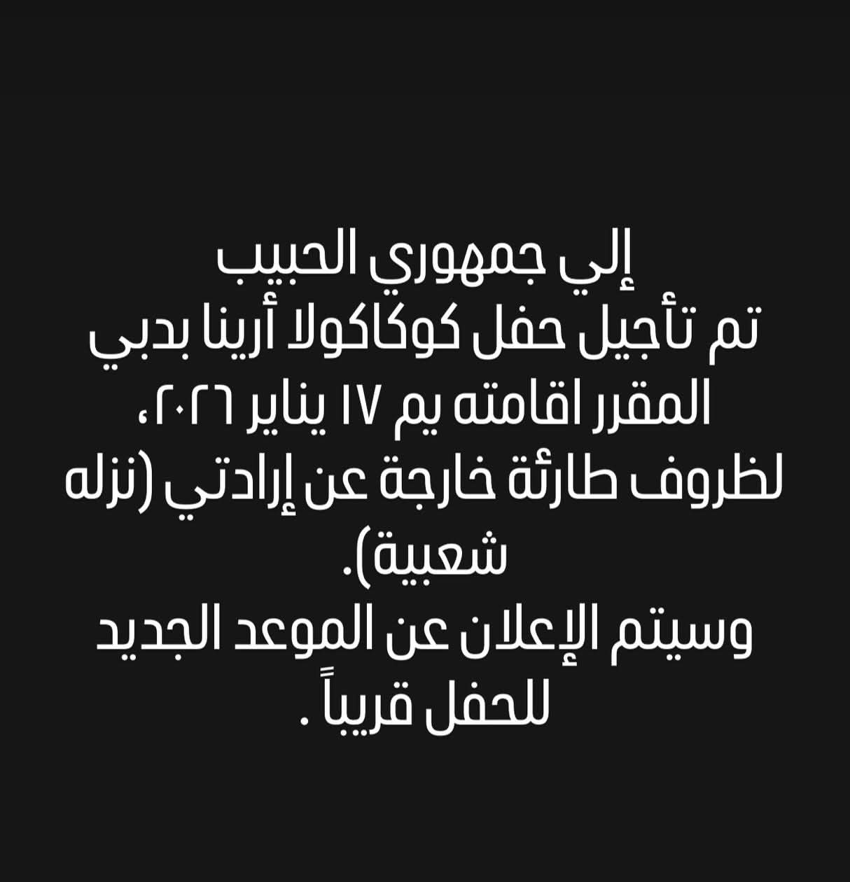 وقال محمد منير في منشوره الذي رصده موقع تحيا مصر على حسابه الرسمي بموقع تبادل الصور والفيديوهات انستجرام: "إلى جمهوري الحبيب تم تأجيل حفل كوكاكولاأرينا بدبي المقرر إقامته يوم 17 يناير 2026 لظروف طارئة خارجة عن إرادتي (نزلة شُعبية)، وسيتم الإعلان عن الموعد الجديد للحفل قريبًا".