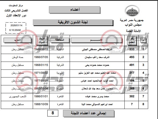 وجاء تشكيل لجنة الشئون الإفريقية ليضم السادة النواب: