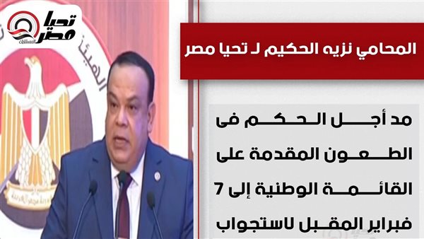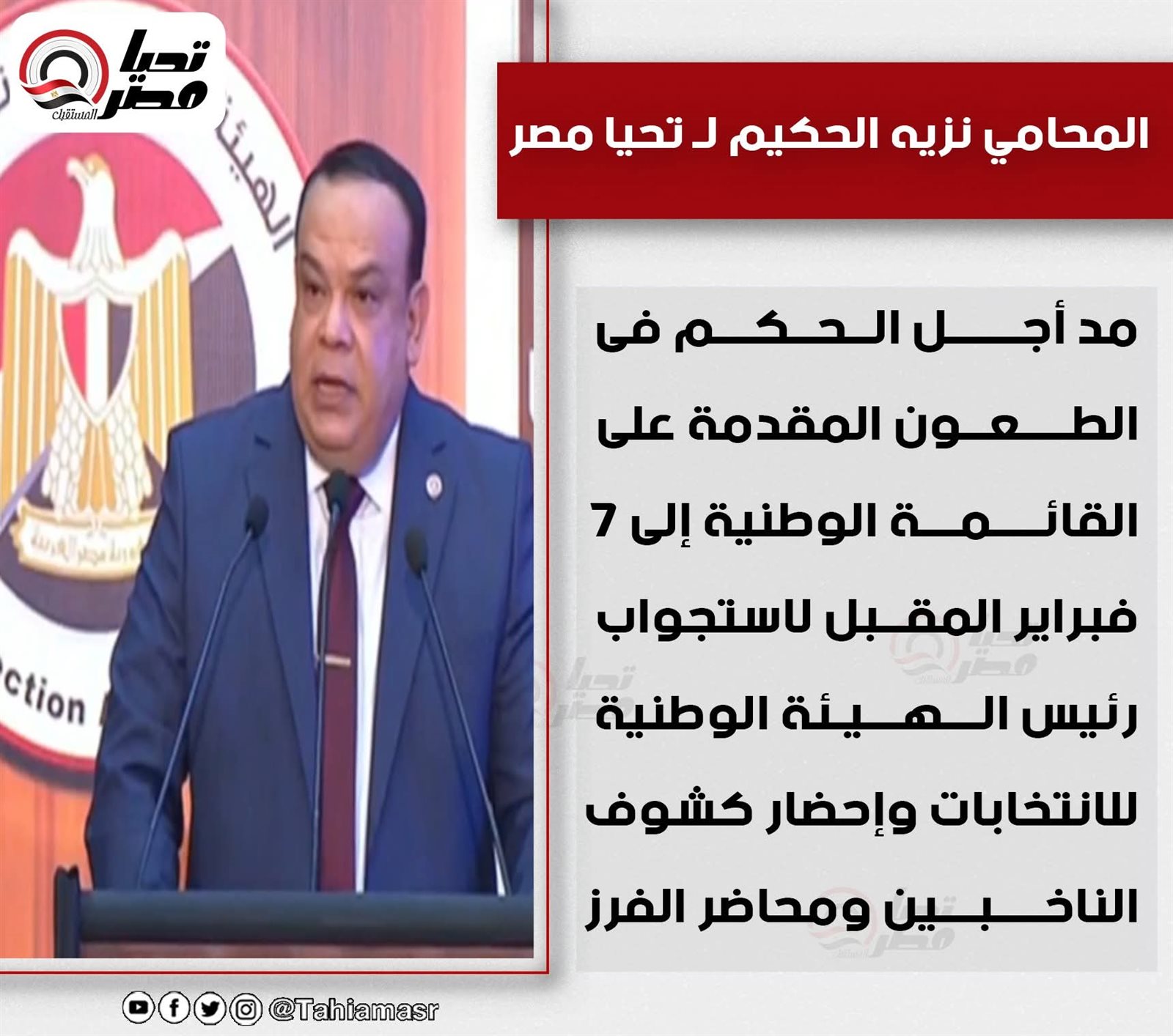 المحامي نزيه الحكيم لتحيا مصر: تأجيل الطعون على القائمة الوطنية إلى 7 فبراير لاستجواب رئيس الهيئة الوطنية للانتخابات