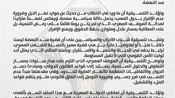 وتؤكد التنسيقية أن ما ورد في الخطاب من حديث عن موارد نهر النيل وضرورة عدم الإضرار بدول المصب، يحمل دلالة سياسية مهمة، ويعكس تفهمًا متزايدًا لعدالة الموقف المصري، الذي لم يكن يومًا قائمًا على رفض التنمية، بل على المطالبة بمسار عادل ومتوازن يحفظ