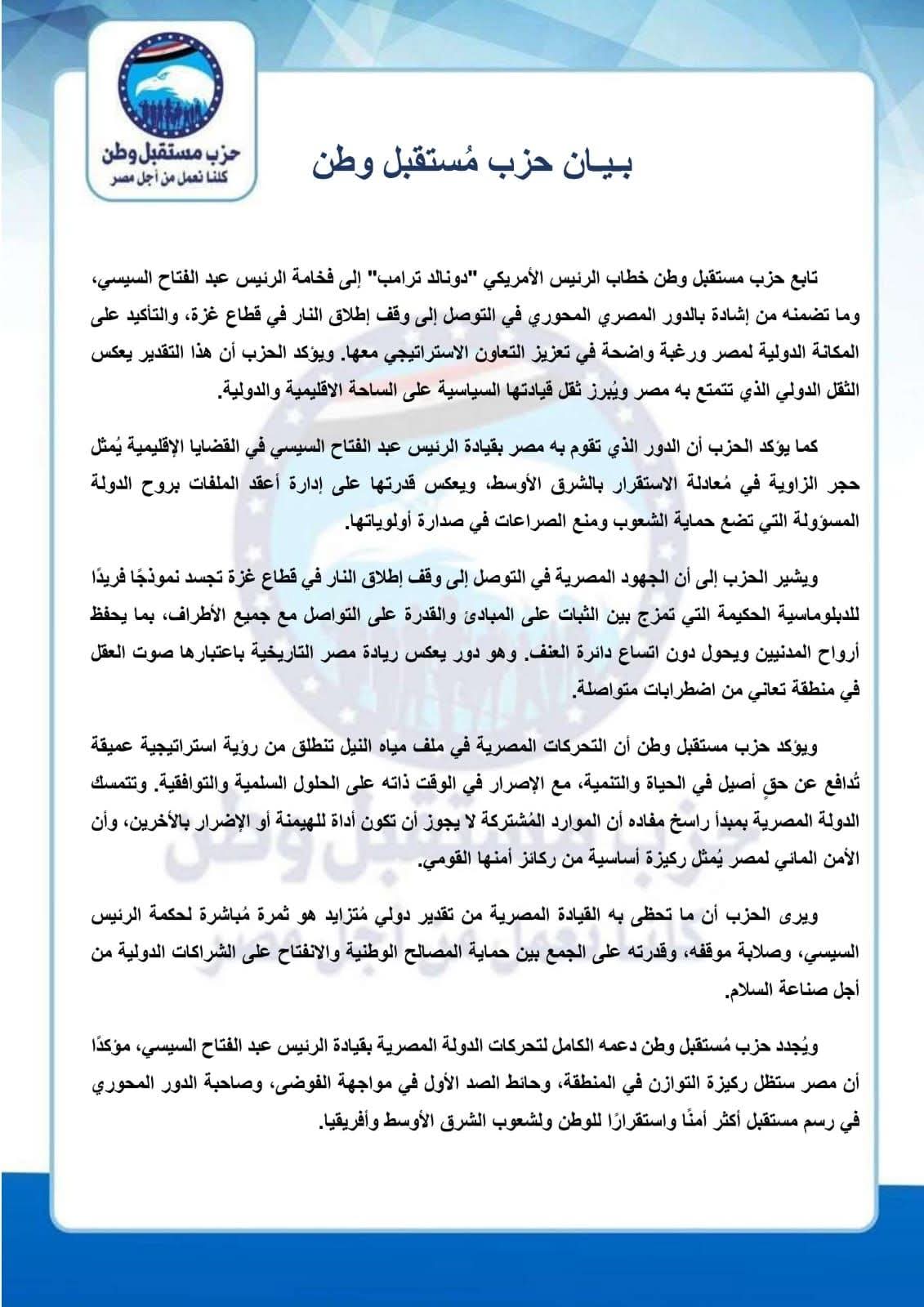 تابع حزب مستقبل وطن خطاب الرئيس الأمريكي دونالد ترامب" إلى الرئيس عبد الفتاح السيسي وما تضمنه من إشادة بالدور المصري المحوري في التوصل إلى وقف إطلاق النار في قطاع غزة، والتأكيد على المكانة الدولية لمصر ورغبة واضحة في تعزيز التعاون الاستراتيجي معها.