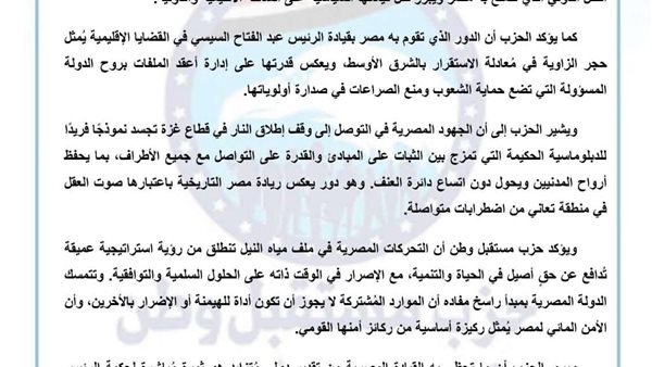 ويشير الحزب إلى أن الجهود المصرية في التوصل إلى وقف إطلاق النار في قطاع غزة تجسد نموذجا فريدا للدبلوماسية الحكيمة التي تمزج بين الثبات على المبادئ والقدرة على التواصل مع جميع الأطراف، بما يحفظ أرواح المدنيين ويحول دون اتساع دائرة العنف. وهو دور يعكس ريادة مصر التاريخية باعتبارها صوت العقل في منطقة تعاني من اضطرابات متواصلة.