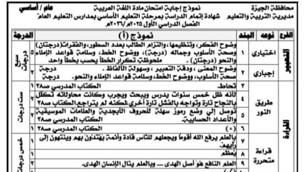 وأكدت مصادر تعليمية أن نموذج الإجابة الرسمي يتم إعداده بواسطة موجهي ومعلمي المادة، وفق نموذج الامتحان الذي تم توزيعه داخل لجان محافظة الجيزة، مع مراعاة تنوع صيغ الأسئلة، واحتساب أكثر من إجابة صحيحة في بعض الجزئيات، خاصة في أسئلة التعبير والقراءة.