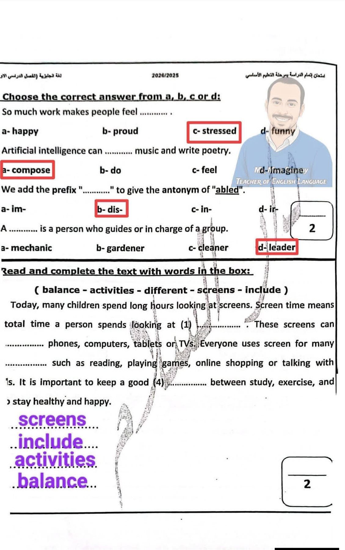 قسم القواعد والمفردات تضمن أسئلة سهلة وواضحة، مع التركيز على استخدام اللغة الإنجليزية بشكل صحيح في سياق الجمل.
