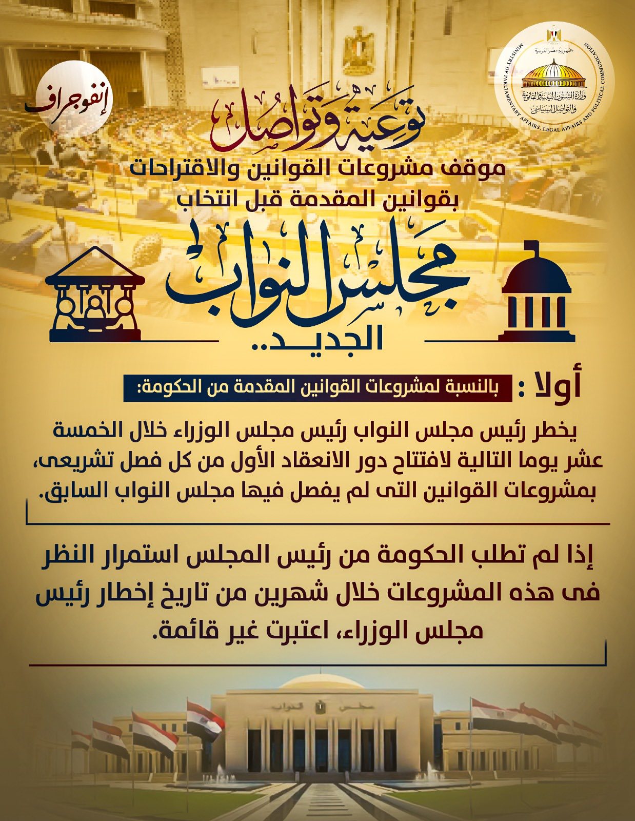 نشرت وزارة الشؤون النيابية والقانونية والتواصل السياسي إنفوجرافًا يوضح موقف مشروعات القوانين والاقتراحات بقوانين المقدمة قبل انتخاب مجلس النواب الجديد، الذي باشر أعماله يوم الاثنين الموافق 12 يناير 2026، بعد ذلك، اكتملت تشكيل مكاتب اللجان النوعية داخل المجلس.