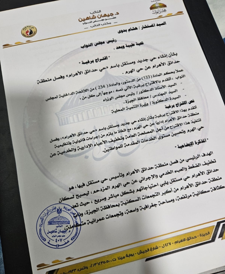 وأوضحت النائبة، في نص الاقتراح، أن الهدف الرئيسي من فصل منطقة حدائق الأهرام يتمثل في تخفيف الضغط الخدمي والإجرائي عن حي الهرم، الذي يعاني من تكدس سكاني مرتفع، إلى جانب تمكين سكان حدائق الأهرام من الحصول على خدماتهم بصورة مباشرة وسريعة من خلال إدارة محلية مستقلة.