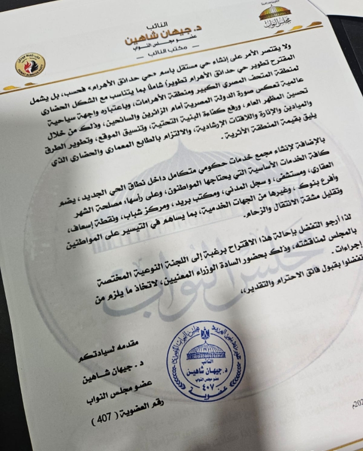 وأضافت أن المقترح لا يقتصر على الفصل الإداري فقط، بل يشمل خطة تطوير شاملة لمنطقة حدائق الأهرام، بما يتناسب مع الطابع الحضاري لمنطقة المتحف المصري الكبير ومنطقة الأهرامات، باعتبارها واجهة سياحية عالمية تعكس صورة الدولة المصرية أمام السائحين والزائرين.