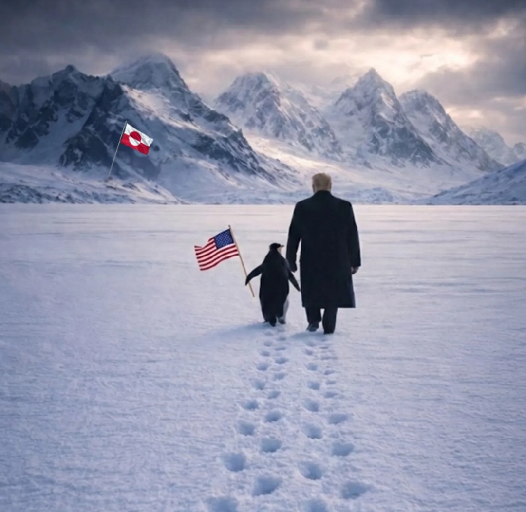 وسبق ونشر ترامب صورة مُولّدة بالذكاء الاصطناعي لنفسه وهو يضع العلم الأمريكي على أراضي جرينلاند على منصته للتواصل الاجتماعي "تروث سوشيال". ويظهر في الصورة ترامب برفقة نائب الرئيس الأمريكي جيه دي فانس ووزير الخارجية ماركو روبيو، مع لافتة قريبة كُتب عليها: "جرينلاند - أرض أمريكية تأسست عام 2026".