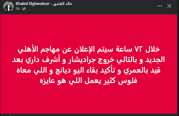 وكتب خالد الغندور عبر حسابه الرسمي "فيس بوك"،، النادي الأهلي سيعلن رسمياً عن هوية مهاجمه الجديد خلال 72 ساعة فقط. هذا الإعلان المرتقب يأتي بعد سلسلة من المفاوضات المكثفة لتعزيز الخط الهجومي، تلبيةً لرغبة الجهاز الفني في المنافسة على كافة الأصعدة، خاصة مع التحديات القارية المتمثلة في دوري أبطال أفريقيا وكأس العالم للأندية.