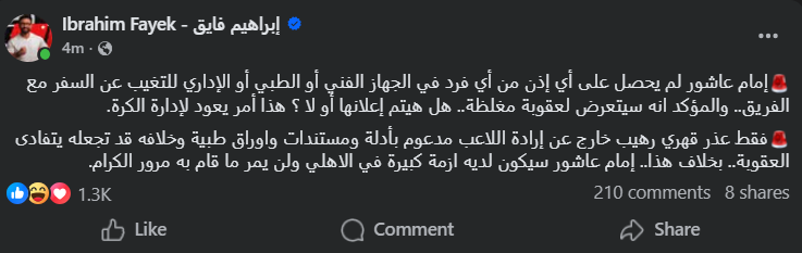 أكد إبراهيم فايق، عبر حساباته الرسمية، أن إمام عاشور لم يحصل على أي إذن مسبق من الجهاز الفني بقيادة مارسيل كولر، أو الجهاز الطبي، أو حتى الإدارة لتخلفه عن السفر. وأوضح فايق أن القواعد الصارمة داخل القلعة الحمراء لا تسمح بمثل هذه التجاوزات، مما يضع اللاعب في مأزق حقيقي أمام لجنة الكرة.