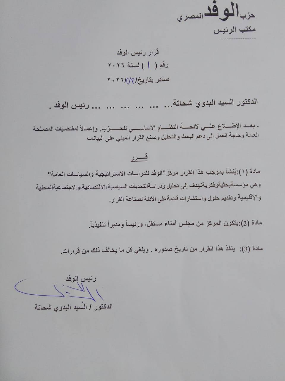 أصدر الدكتور السيد البدوى شحاته رئيس حزب الوفد قرارا حمل رقم ١ لسنة ٢٠٢٦ ،بإنشاء مركز الوفد للدراسات الإستراتيجية والسياسات العامه ،إعمالا لمقتضيات المصلحه العامه وحاجة العمل إلى دعم البحث والتحليل وصنع القرار المبنى على البيانات .