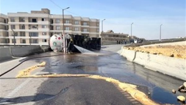 بحمولة 50 طنًا.. انقلاب سيارة نقل مواد بترولية على محور حسب الله الكفراوي