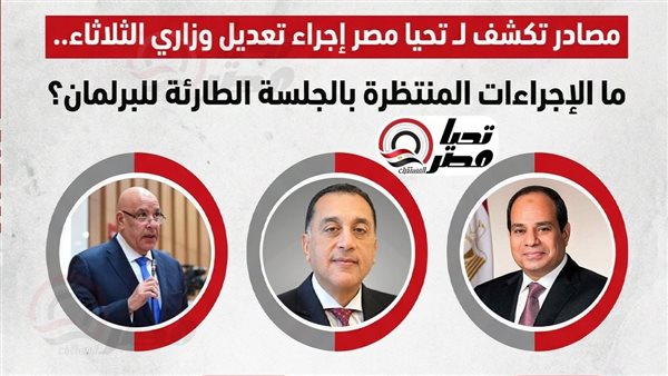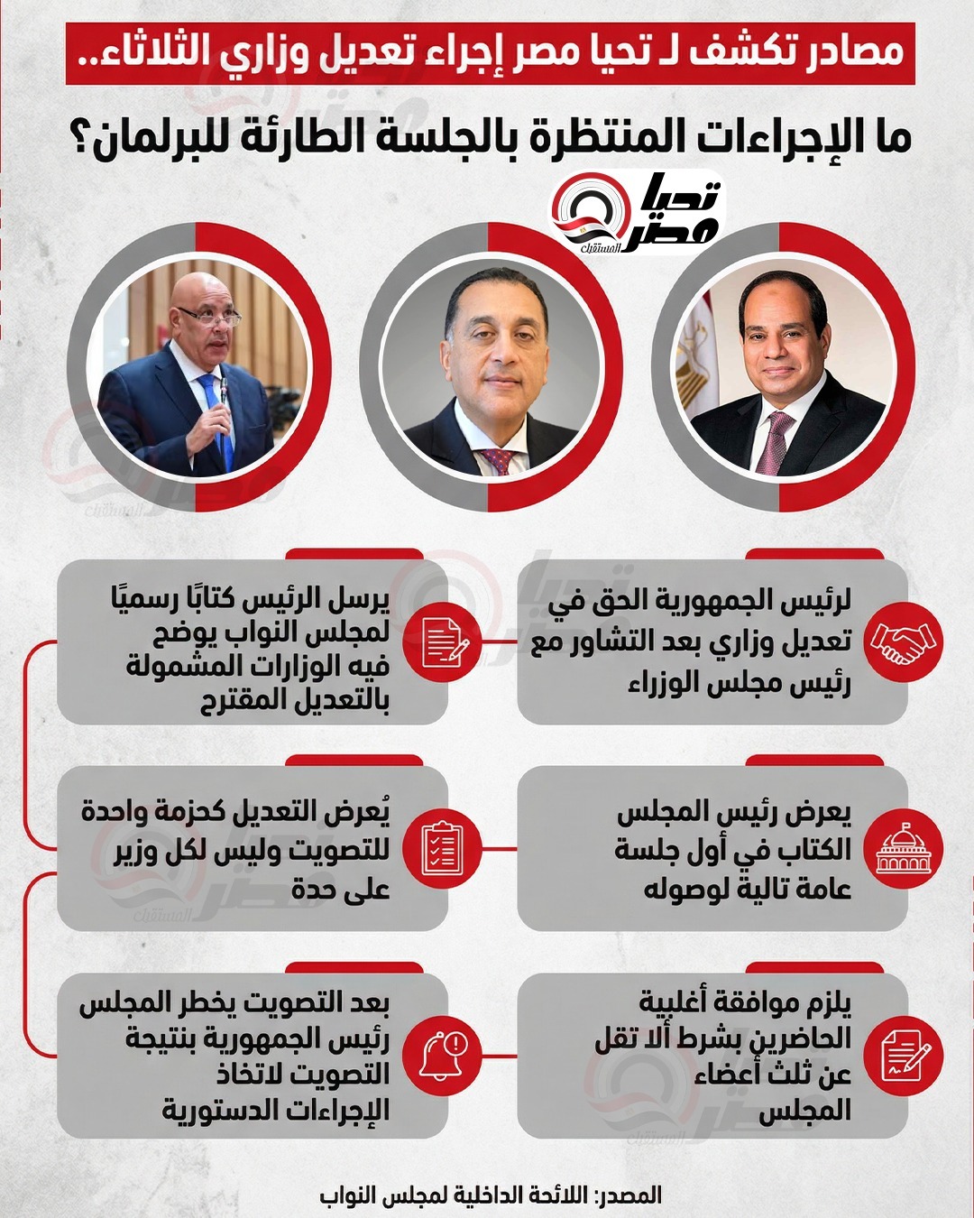كشفت مصادر مطلعة لموقع «تحيا مصر» عن اتجاه لإجراء تعديل وزاري مرتقب يوم الثلاثاء المقبل، وذلك وفقا للإجراءات الدستورية واللائحية المنظمة للعلاقة بين السلطتين التنفيذية والتشريعية.