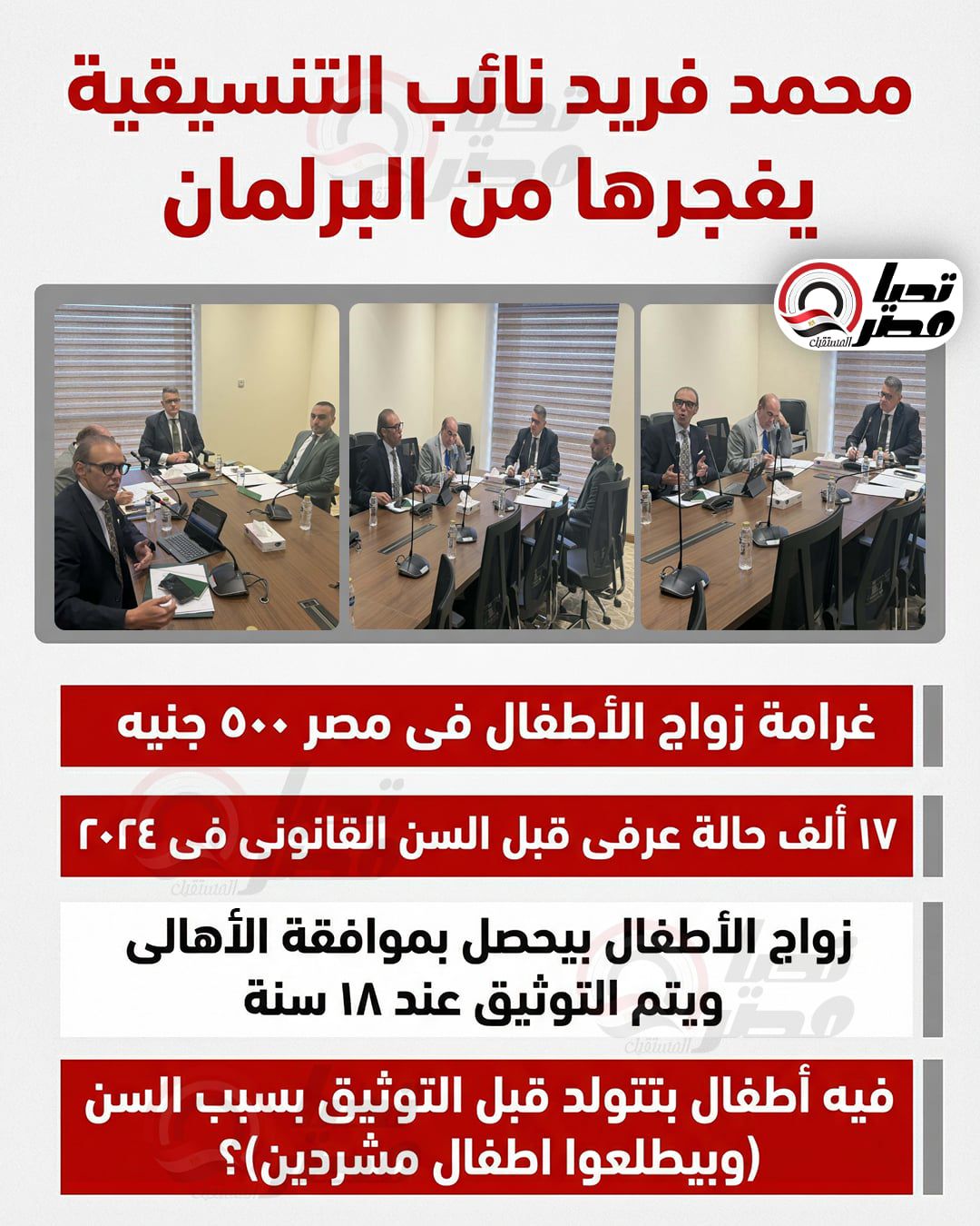 قال النائب محمد فريد عضو مجلس النواب عن تنسيقية شباب الأحزاب والسياسيين، إن غرامة زواج الأطفال في مصر لا تتجاوز 500 جنيه، معتبرًا أن قيمة الغرامة الحالية لا تمثل رادعًا كافيًا لمواجهة هذه الظاهرة الخطيرة.