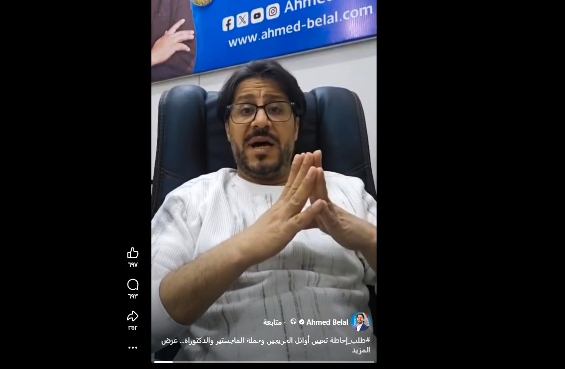 وأوضح أن هذا الإعلان لم يترجم إلى تعيينات فعلية حتى الآن، مشيرًا إلى أنه لم يتم تعيين أعداد تُذكر، كما لم يكن هناك نصيب واضح لحملة الماجستير والدكتوراه ضمن هذه التعيينات.