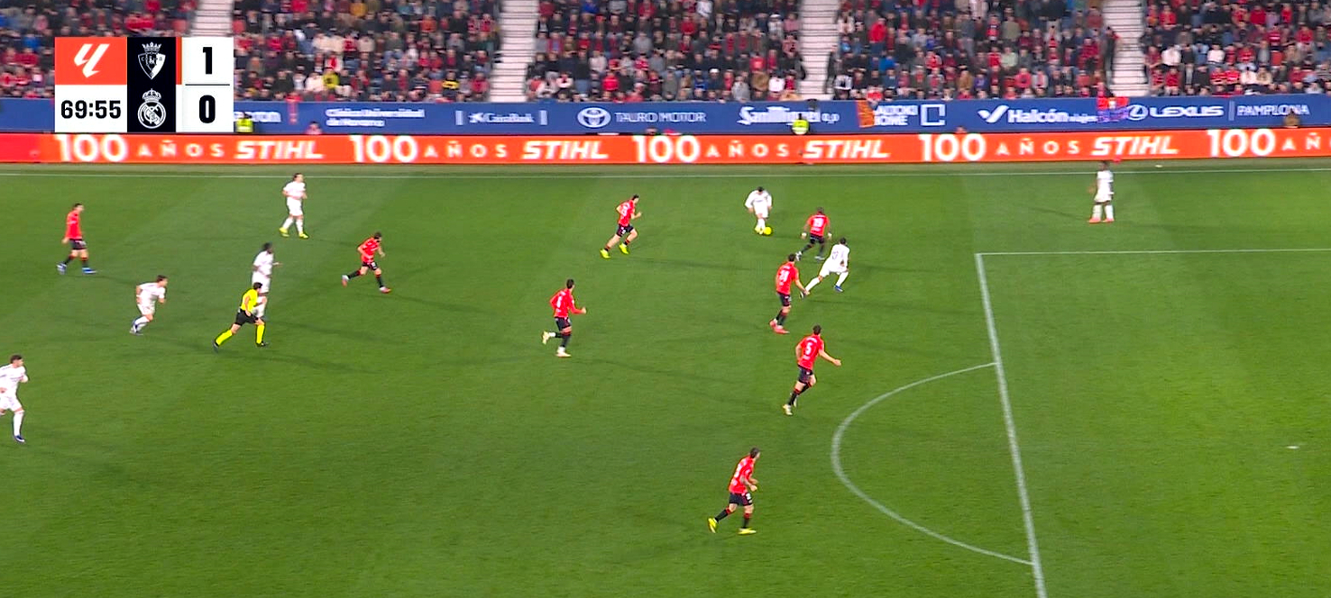 في المقابل، اعتمد أوساسونا على غلق المساحات واللعب على المرتدات السريعة التي كادت أن تضيف هدفًا ثانيًا في أكثر من مناسبة خلال مواجهة أوساسونا ضد الريال.