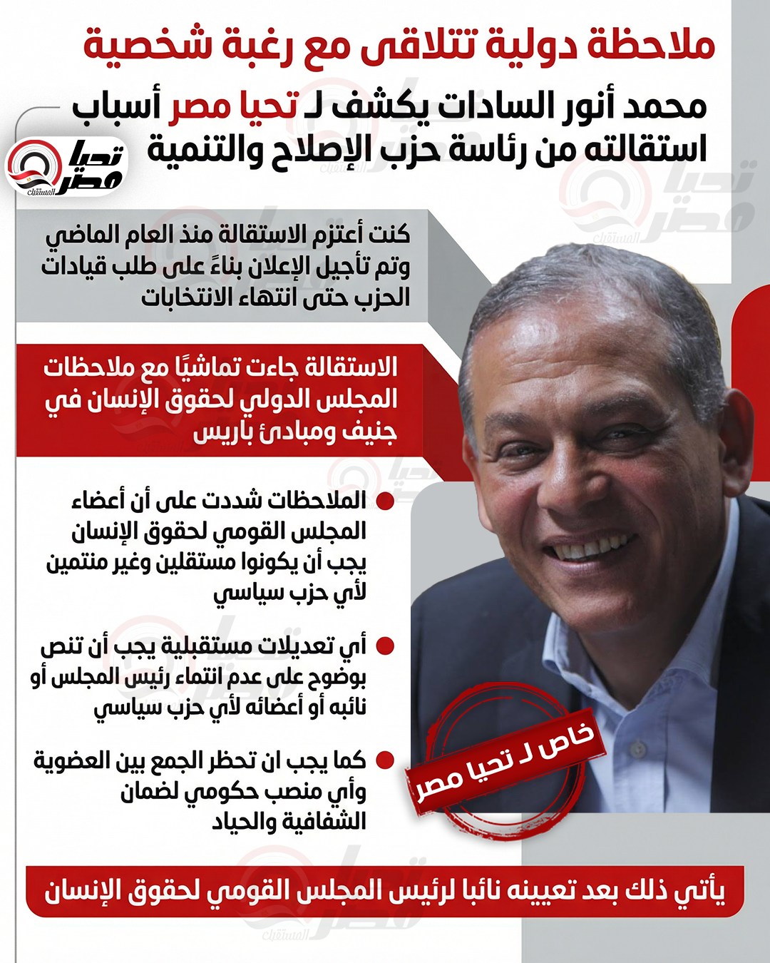 وأشار إلى أن الاستقالة جاءت انسجامًا مع المراجعة الخاصة بتصنيف المجلس القومي لحقوق الإنسان، والتي تنشأ بموجب قانون خاص، مشيرًا إلى ملاحظات المجلس الدولي لحقوق الإنسان في جنيف ومبادئ باريس، التي تؤكد أن أي عضو في المجلس، سواء كان عضوًا عاديًا أو في منصب قيادي، لا يجب أن يكون منتمياً لأي حزب سياسي، وذلك لضمان الحيادية والشفافية في العمل.