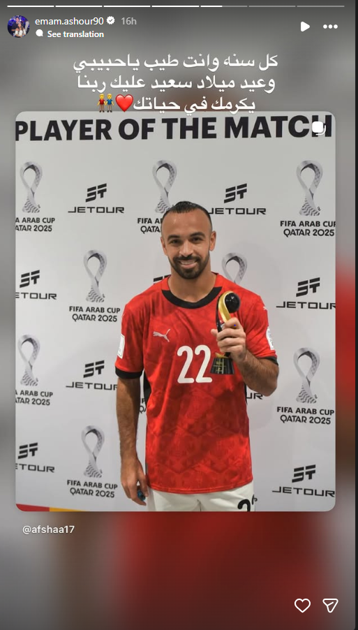 تحيا مصر، ونشر إمام عاشور عبر حسابه الرسمي بموقع التواصل الاجتماعي إنستجرام صورة تجمعه بزميله أفشة، ووجه له رسالة تهنئة قال فيها: "كل سنة وأنت طيب يا حبيبي وعيد ميلاد سعيد عليك ربنا يكرمك في حياتك"، وهي الرسالة التي لاقت تفاعلًا كبيرًا من جماهير الأهلي التي حرصت بدورها على تهنئة نجم الفريق.