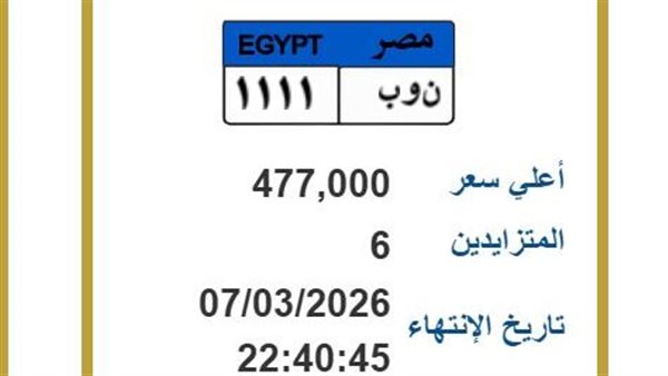 لوحة «ن و ب 1111» تصل المزاد الإلكتروني إلى 477 ألف جنيه