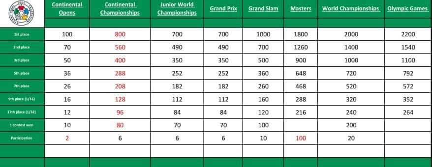 وتمنح البطولات القارية المفتوحة أقل عدد من النقاط، حيث يحصل صاحب المركز الأول على 100 نقطة، بينما تمنح بطولات العالم والدورات الأولمبية أعلى عدد من النقاط، إذ يحصل أصحاب المراكز الأولى على 2000 نقطة في بطولات العالم و2200 نقطة في الألعاب الأولمبية.