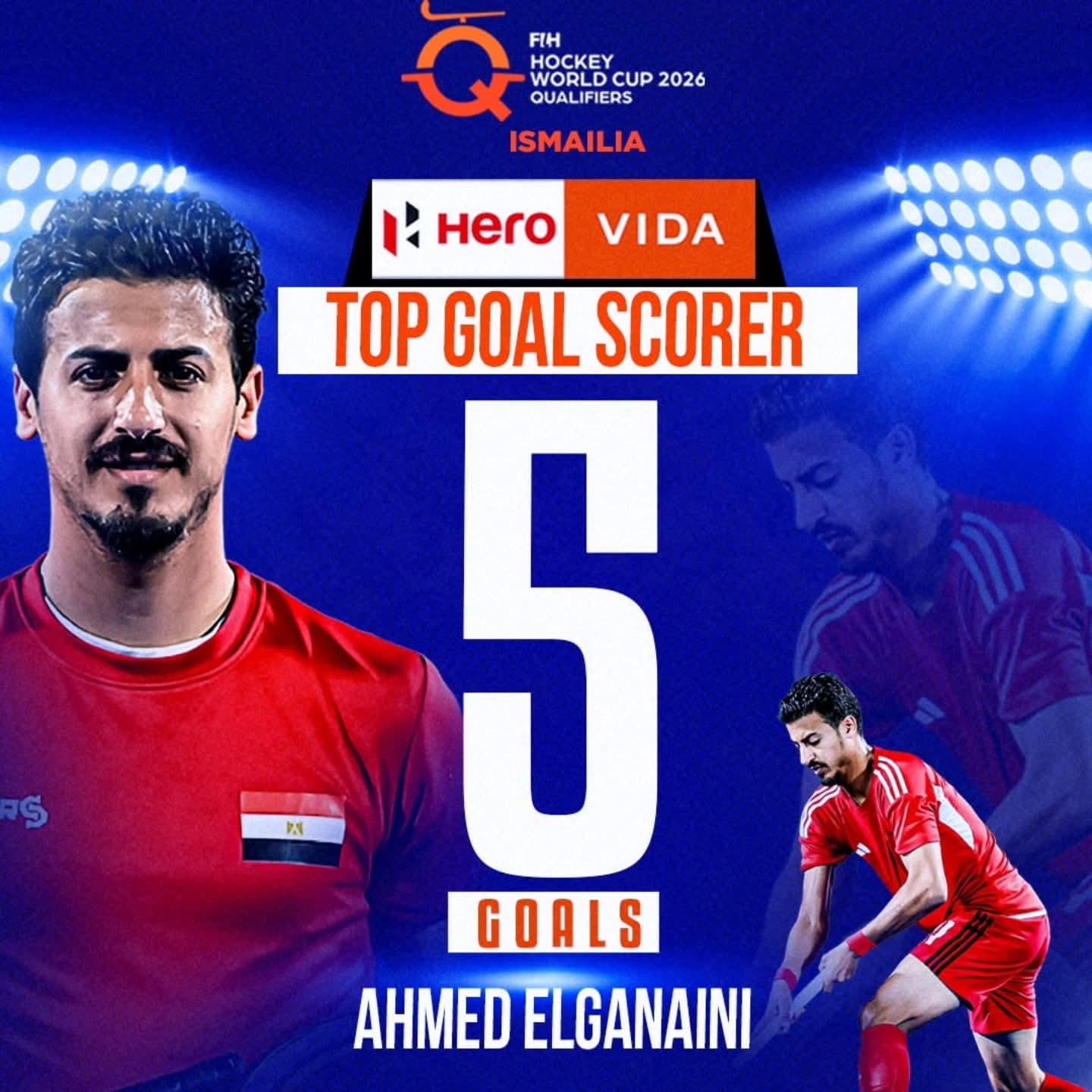 ونجح اللاعب في تسجيل خمسة اهداف خلال مباريات البطولة مع منتخب مصر هوكي ليحصد لقب هداف المنافسات ويؤكد تألقه مع المنتخب الوطني خلال التصفيات.