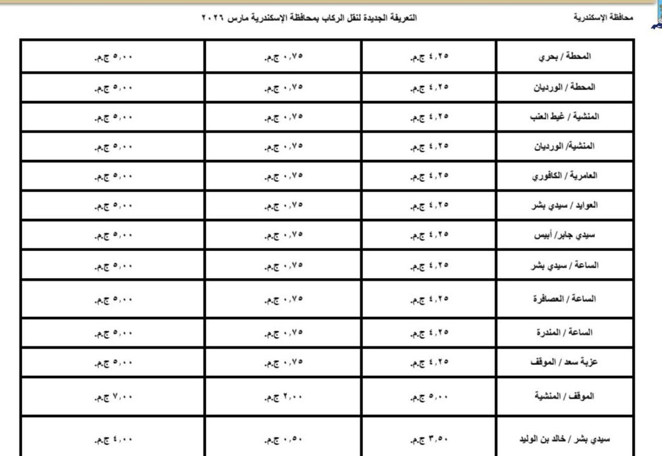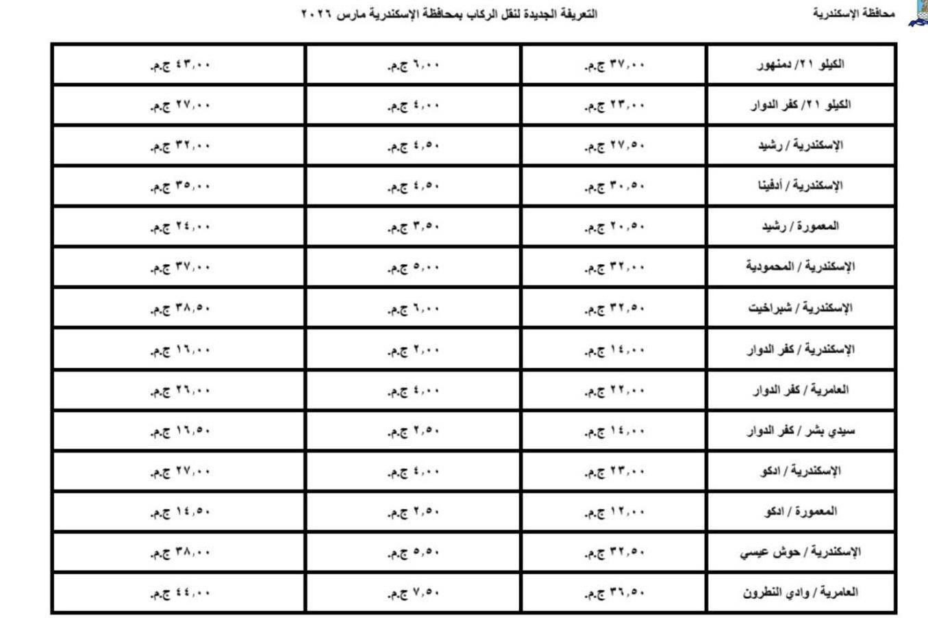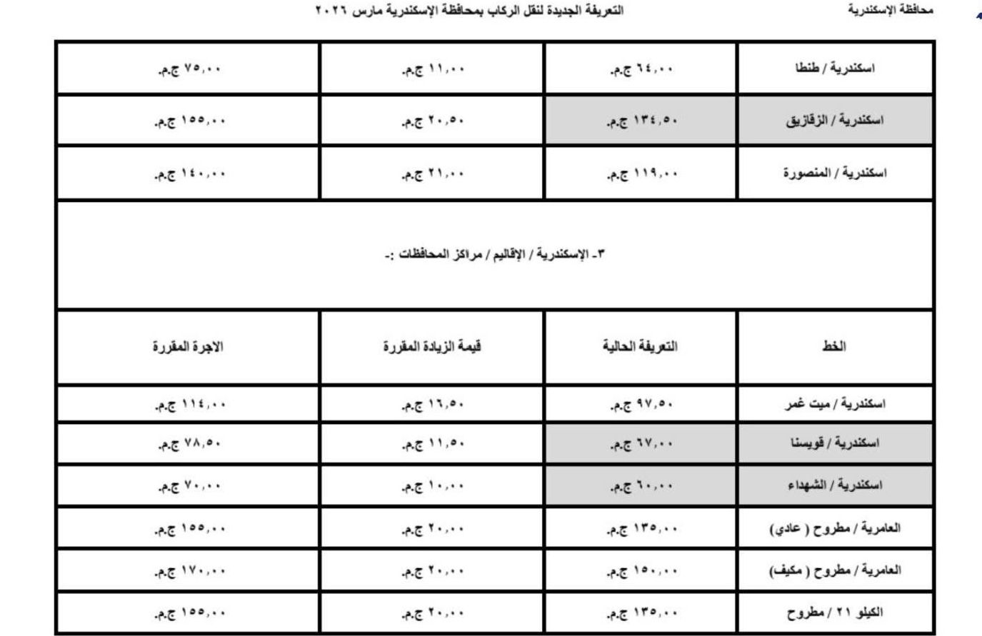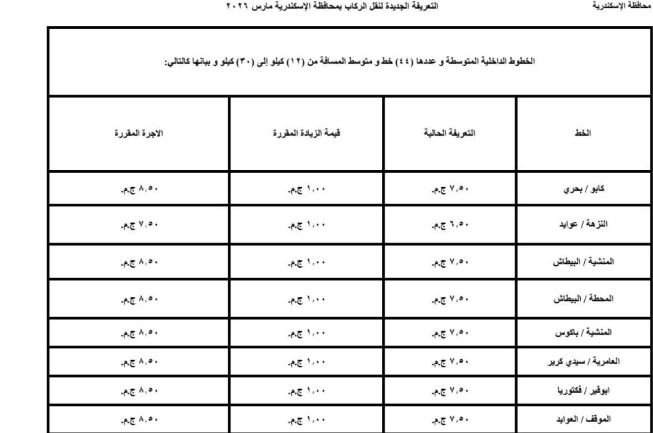 اعتمد اليوم محافظ الإسكندرية، تعريفة الركوب الجديدة لسيارات الأجرة لوسائل النقل الداخلية والخارجية والنقل العام بالمحافظة والمقدمة من مشروع مواقف سيارات النقل الجماعى والهيئة العامة لنقل الركاب بمحافظة الاسكندرية ويتم تطبيقها بدء من تاريخ الاعتماد طبقا للجداول المرفقة، وذلك في ضوء قرار لجنة التسعير التلقائي لأسعار المنتجات البترولية بوزارة البترول وتحريك الأسعار لبعض