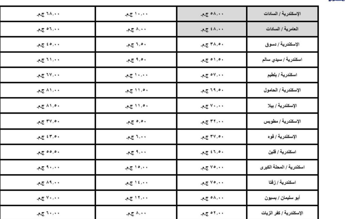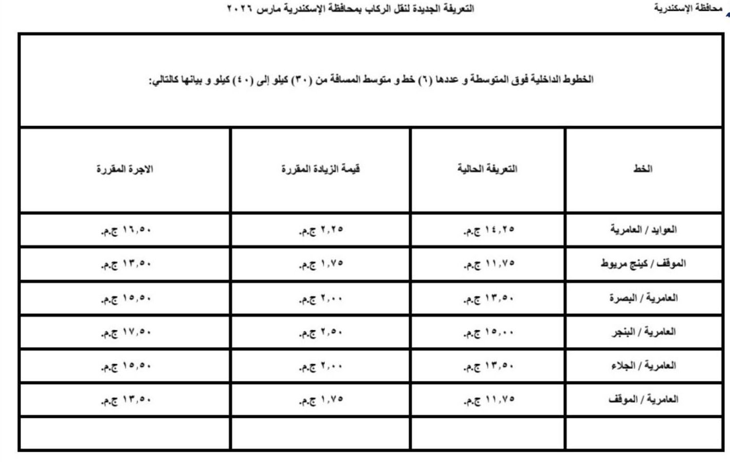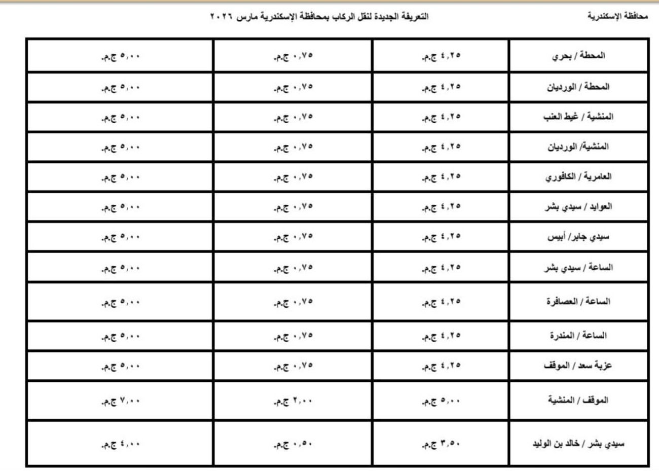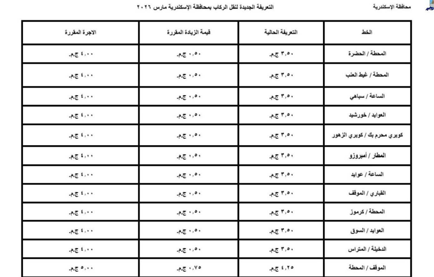اعتمد اليوم محافظ الإسكندرية، تعريفة الركوب الجديدة لسيارات الأجرة لوسائل النقل الداخلية والخارجية والنقل العام بالمحافظة والمقدمة من مشروع مواقف سيارات النقل الجماعى والهيئة العامة لنقل الركاب بمحافظة الاسكندرية ويتم تطبيقها بدء من تاريخ الاعتماد طبقا للجداول المرفقة، وذلك في ضوء قرار لجنة التسعير التلقائي لأسعار المنتجات البترولية بوزارة البترول وتحريك الأسعار لبعض