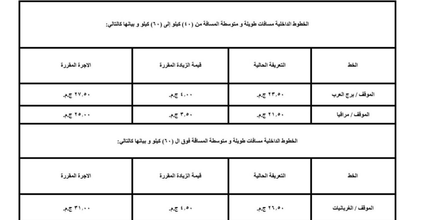 كما شكل لجنة لتعديل التعريفات وضعت في إعتبارها مسافة كل خط سير وعدد الرحلات تحقيقًا للعدالة، مشيراً إلى أن متوسط الزيادة من ١٤ إلى ١٧٪ بالنسبة لسيارات السيرفيس، أما عن أسعار تعريفة الركوب في وسائل النقل العام والنقل الجماعي، ووسائل النقل البديلة للترام لم تتغير، على أن يتم إعلان التعريفات الجديدة وتعليقها بكافة المواقف و بصورة واضحة.