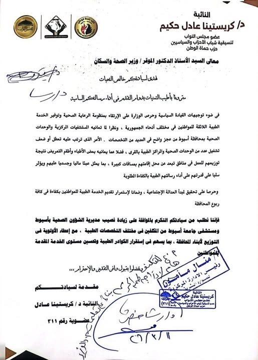 أوضحت النائبة كريستينا عادل، عضو مجلس النواب، أنها لاحظت منذ أدائها اليمين الدستورية تفاقم مشاكل العجز في الأطباء وأطقم التمريض بمحافظة أسيوط، مما أدى إلى ضعف أو تعطيل تشغيل العديد من الوحدات الصحية والمستشفيات في القرى والمراكز.