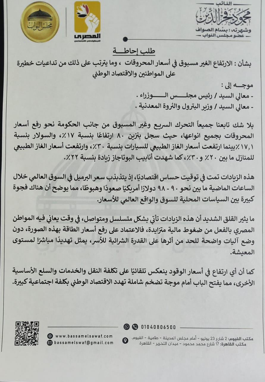 تقدم النائب بسام الصواف عضو مجلس النواب عن الحزب المصري الديمقراطي الاجتماعي بطلب إحاطة إلي المستشار هشام بدوي رئيس مجلس النواب ، موجه إلى رئيس مجلس الوزراء ووزير البترول والثروة المعدنية بشأن : الارتفاع الغير مسبوق في أسعار المحروقات ، وما يترتب على ذلك من تداعيات خطيرة على المواطنين والاقتصاد الوطني.