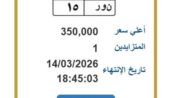 مع استمرار مزاد اللوحات المميزة على بوابة مرور مصر الإلكترونية، تصدرت لوحة رقم (ن ور – 15) عناوين اهتمام المتابعين بعد أن وصل سعرها إلى 350 ألف جنيه، مع انتهاء المزايدة المقررة غدًا السبت 14 مارس 2026.