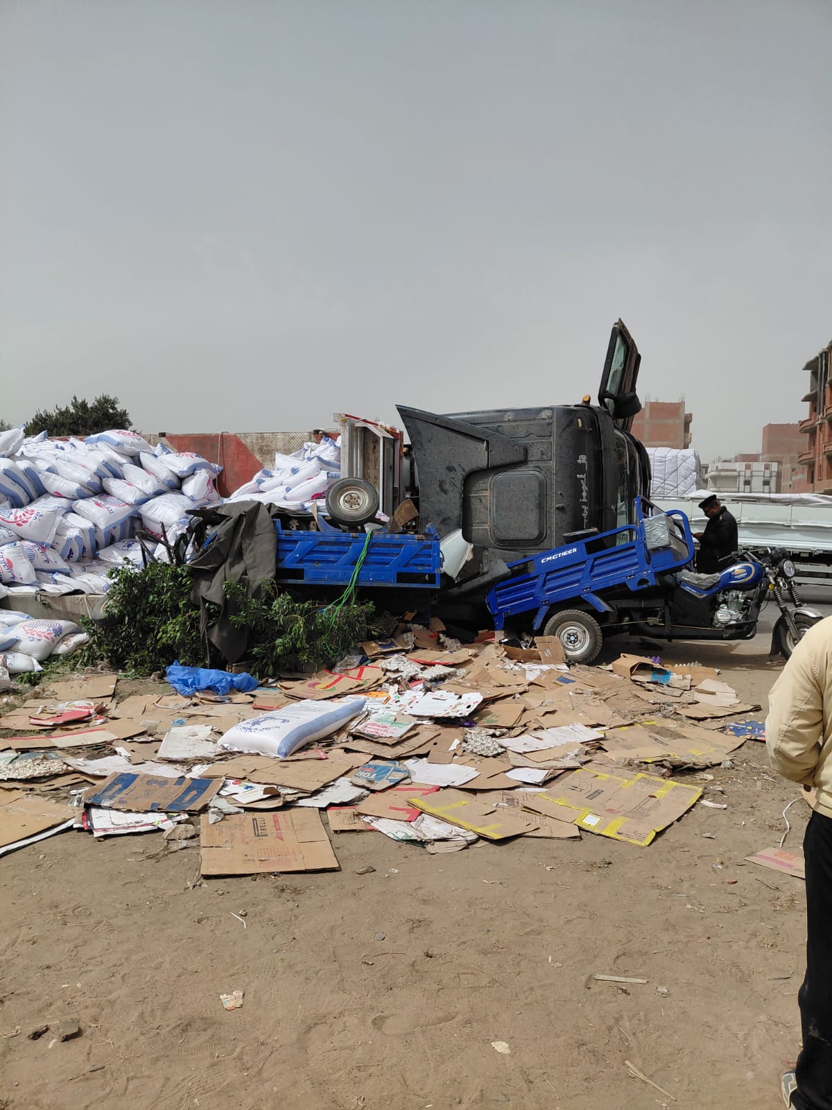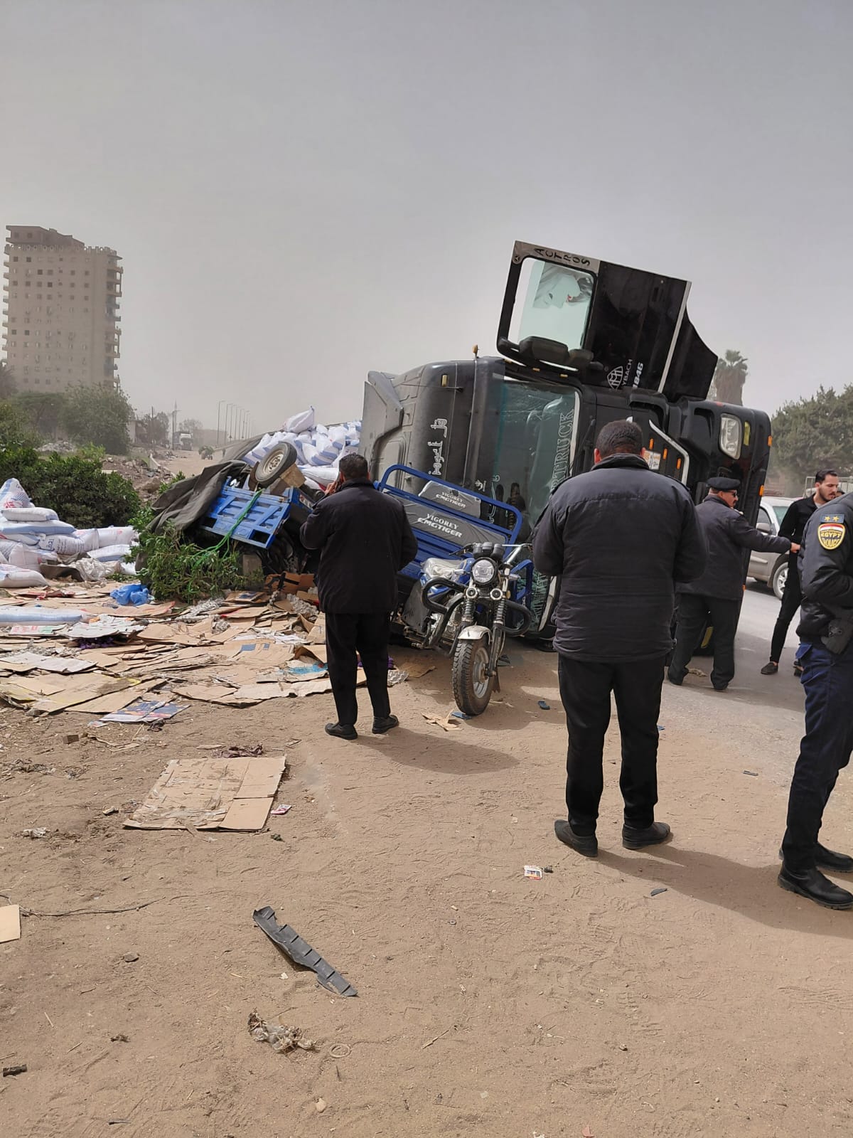 تبين من الفحص الأولي تصادم سيارة نقل بمقطورة مع تروسيكل أثناء سيرهما بالطريق، ما أدى إلى انقلاب المركبتين ووقوع حالة وفاة وعدد من المصابين.