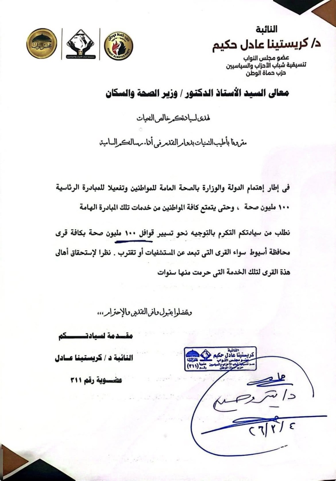 أوضحت النائبة أنها تتقدم بالشكر لفخامة عبد الفتاح السيسي ولمعالي الدكتور وزير الصحة على الموافقة على استثناء قرية منشية ناصر من شروط المبادرة، وإطلاق القافلة بها وفق التوجيهات الصادرة بتاريخ 4-3-2026.