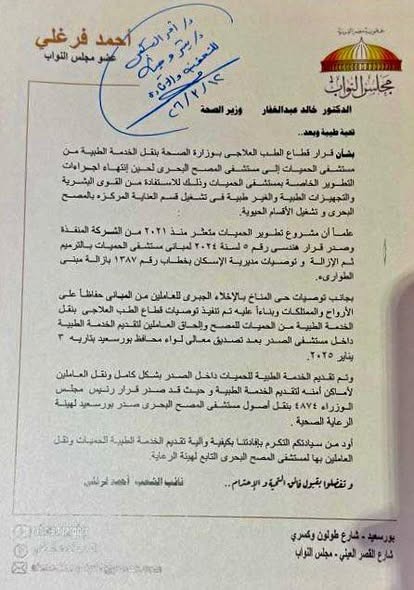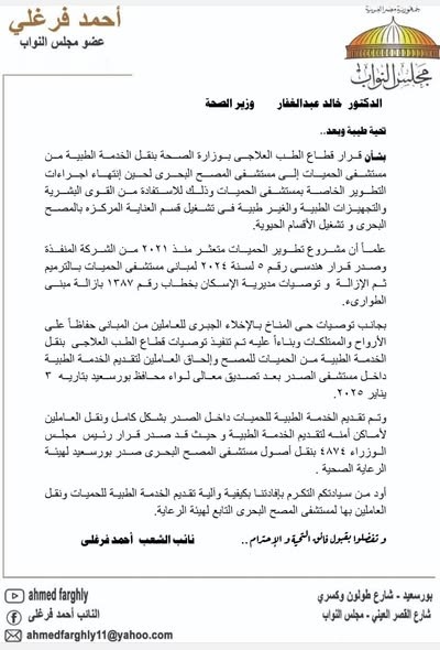 النائب أحمد فرغلي يناقش مع وزير الصحة معوقات تشغيل مستشفيات بورسعيد ويبحث حلولاً عاجلة