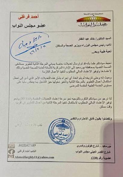 تم عقد اجتماعا بين النائب أحمد فرغلي عضو مجلس النواب، ووزير الصحة لعرض مشاكل عدم التشغيل الكامل لـمستشفى جامعة بورسعيد والتنسيق مع وزارة التعليم العالي المصرية لحل المعوقات، وكذلك مناقشة تأخر بدء إنشاء المرحلة الثانية لمستشفى الصحة النفسية لحل مشكلة قلة سرائر أقسام الصحة النفسية والإدمان.