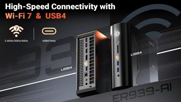 يوفر Minix ER939 مجموعة واسعة من منافذ الاتصال، تشمل USB4 و**USB 3.2 Gen 2** بالإضافة إلى منافذ HDMI 2.1 و**DisplayPort 1.4** لتوصيل الشاشات بدقة عالية.