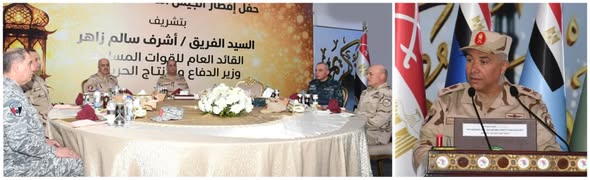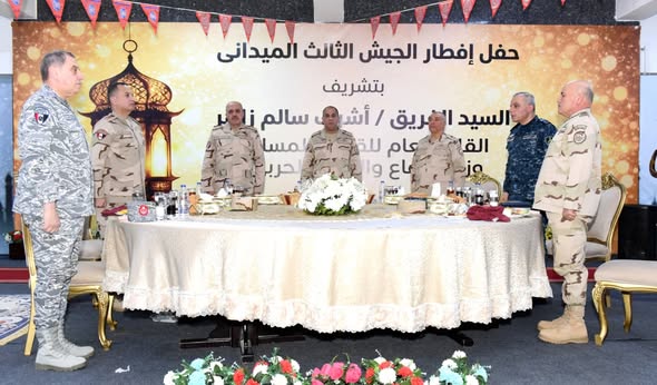 وأكد القائد العام للقوات المسلحة أن الدفاع عن الوطن مهمة مقدسة تتطلب الإستعداد الدائم لمواجهة مختلف التحديات وأن القوات المسلحة بما تمتلكه من منظومة تسليح متطورة قادرة على تأمين كافة الحدود الإستراتيجية للدولة ، مشيداً بما يبذله رجال الجيش الثالث الميدانى وقوات شرق القناة لمكافحة الإرهاب من جهود فى تنفيذ مهامهم بكفاءة وإقتدار ، فضلاً عن دورهم فى دعم منظومة التنمية الشاملة التى تنفذها الدولة المصرية بسيناء ، وفى ختام اللقاء شاركهم تناول وجبة الإفطار .