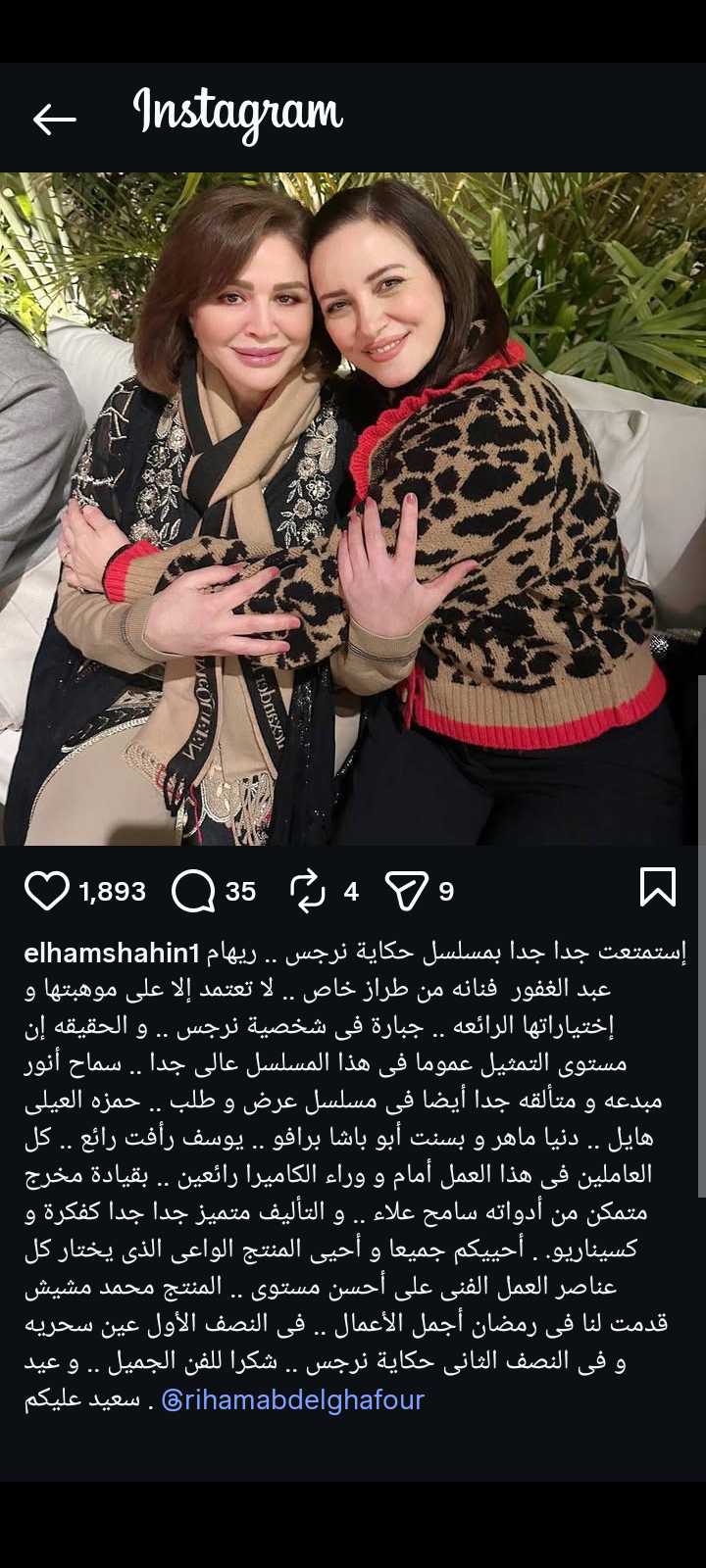 قالت إلهام شاهين في منشور رصده موقع تحيا مصر على حسابها الرسمي بموقع تبادل الصور والفيديوهات انستجرام: استمتعت جدا جدا بمسلسل حكاية نرجس .. ريهام عبد الغفور فنانه من طراز خاص .. لا تعتمد إلا على موهبتها و إختياراتها الرائعه .. جبارة فى شخصية نرجس.