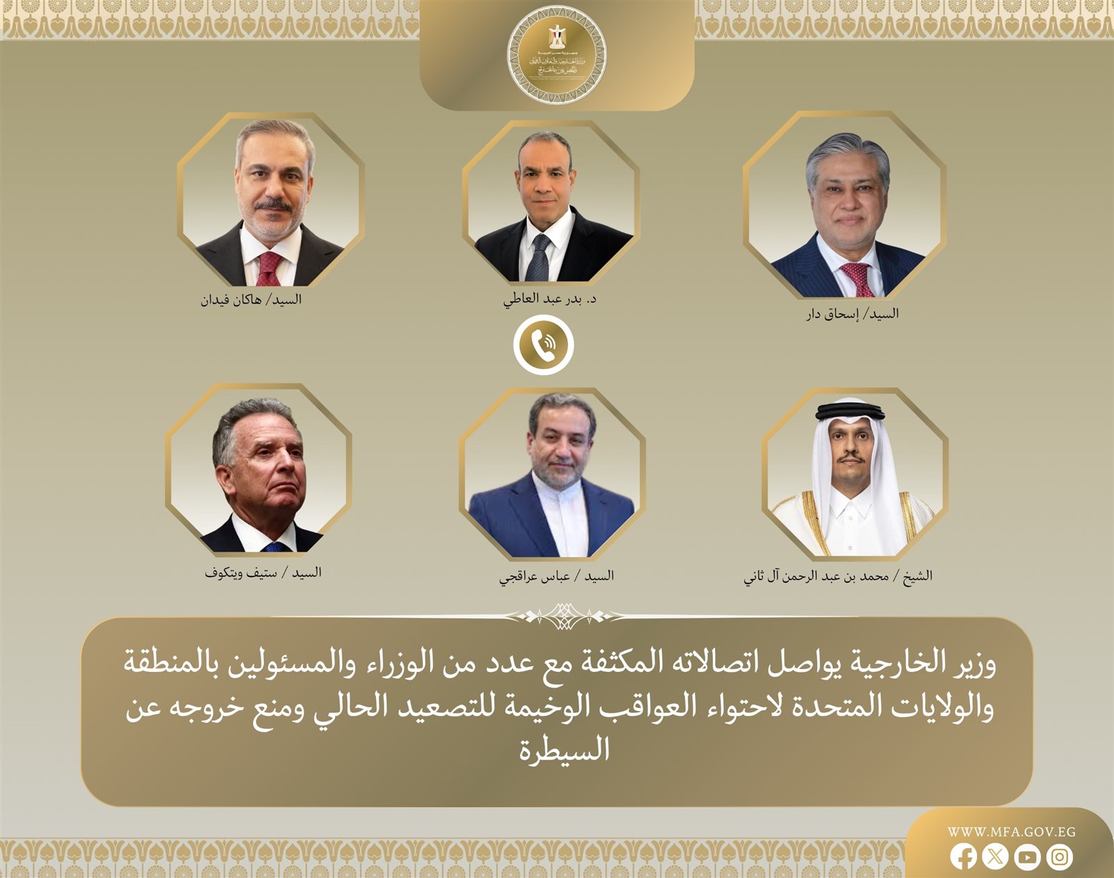 جدد د. بدر عبد العاطي وزير الخارجية والتعاون الدولي والمصريين بالخارج، التأكيد على موقف مصر الرافض للاعتداءات الإيرانية على دول الخليج، مشدداً على أمن الخليج جزء لا يتجزأ من الأمن القومي المصري. وجاء ذلك خلال اتصالات هاتفية أجراها الوزير عبد العاطي مع كل من إسحاق دار نائب رئيس الوزراء وزير الخارجية الباكستاني، وهاكان فيدان وزير خارجية تركيا، والشيخ محمد بن عبد الرحمن آل ثاني رئيس الوزراء وزير الخارجية القطري، وعباس عراقجى وزير الخارجية الايرانى، و ستيف ويتكوف المبعوث الأمريكي الخاص للشرق الأوسط، يوم الأحد، وذلك بتوجيهات من الرئيس عبد الفتاح السيسي، فى إطار متابعة التطورات المتلاحقة فى المنطقة والمساعي الحثيثة المبذولة لخفض التصعيد ووقف الحرب.